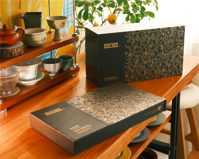 礼盒之上,小罐茶独有的金色茶枝纹悄然蔓延,似植物生长,又似光线流淌,覆盖出一片极具现代艺术感的静谧森林。每一罐茶,都是对一片山水、一门技艺的专注表达。