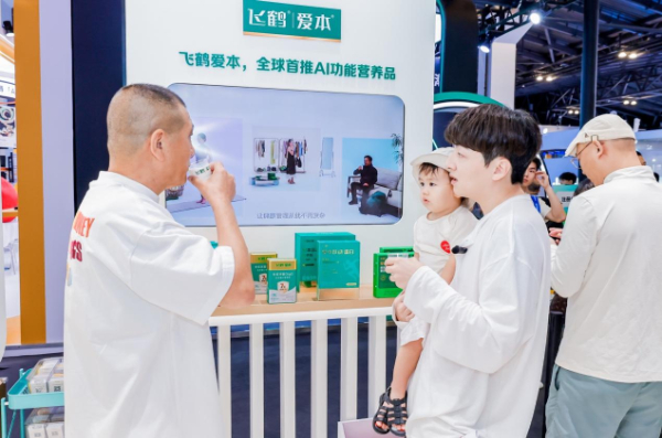 世界人工智能大会现场,观众体验飞鹤首款AI功能营养品——爱本跃动蛋白粉